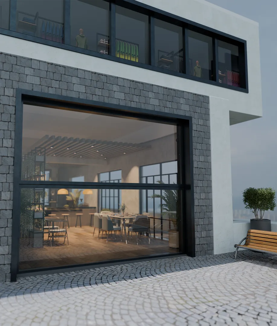 When open, the door can simultaneously serve as a canopy for outdoor seating, integrate seamlessly into a glass façade, or act as a striking garage door, setting a distinctive design accent. It has an exceptionally robust design, enabling it to accommodate even wide and heavy systems. The well-considered technology ensures smooth, quiet operation, extending the lifespan and minimising maintenance requirements. From self-locking mechanisms to powerful lifting systems - every detail is designed with safety in mind. Simple installation, flexible adaptability and the option for manual operation in emergencies make our solution as practical as it is innovative.